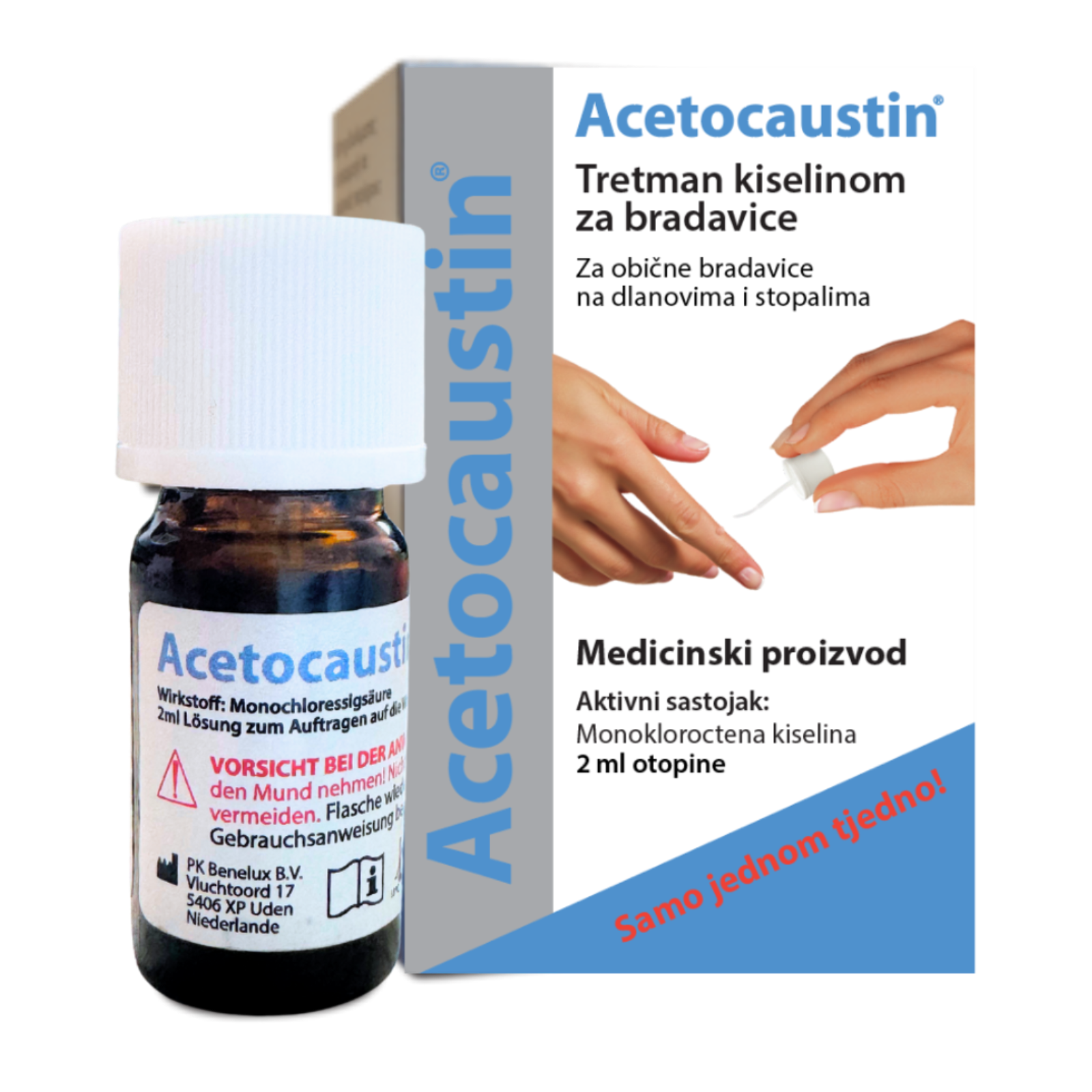 Acetocaustin tretman kiselinom za bradavice sadrži monokloroctenu kiselinu, tvar koja ima keratolitički učinak na kožu.