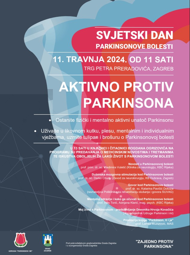 Obilježavanje Dana Parkinsonove bolesti održat će se 11. travnja 2024. godine, od 11.00 do 13.00 sati na Trgu Petra Preradovića. Predstavnici Udruge dijelit će zainteresiranim građanima informativne i promotivne materijale te crvene tulipane kao simbole borbe protiv Parkinsonove bolesti. Održat će se i art radionica i likovni kutak. Uz to, psihologice će kroz mentalni kutak raditi na mentalnom osnaživanju oboljelih, dok ćemo uz pomoć plesa i individualnim vježbama educiranog fizioterapeuta potaknuti na fizičku aktivnost.
