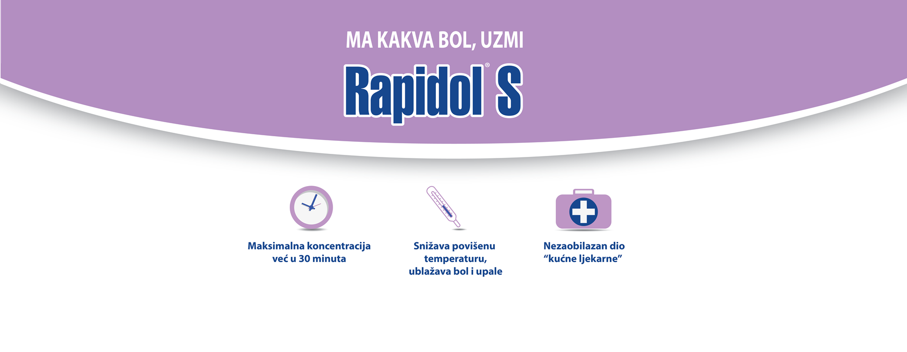 Rapidol®S snižava povišenu tjelesnu temperaturu, smanjuje bol i ublažava simptome prehlade i gripe. Koristi se za otklanjanje bolova blagog do umjerenog intenziteta, kao što su glavobolja, migrena, zubobolja, menstrualni bolovi, bolovi u leđima, bolovi u zglobovima, istegnuće mišića, neuralgija i reumatski bolovi. Rapidol®S je proizveden modernom tehnologijom u obliku mekih gel kapsula i postiže maksimalnu koncentraciju već za 30 minuta.